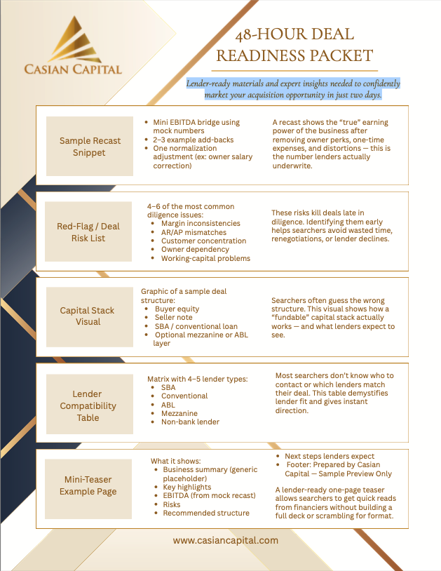 Hi Searchers! If you want fast lender feedback without spending days building materials, I created a 48-Hour Deal Readiness Packet designed to give you clarity immediately.