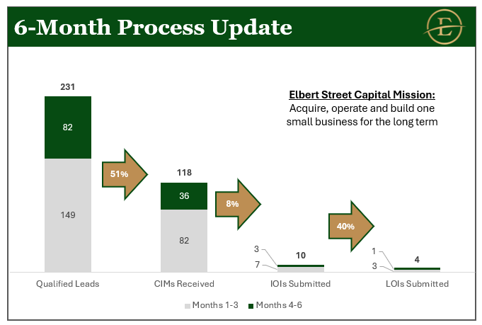 In the first three months, I cast a wide net. The next three were about refining my approach and improving efficiency. While I have not changed my criteria, I am significantly better at screening for opportunities upfront that are a fit for me. I’m now reviewing fewer CIMs—but they’re better aligned with my investment thesis. More screening upfront means less wasted time down the line.