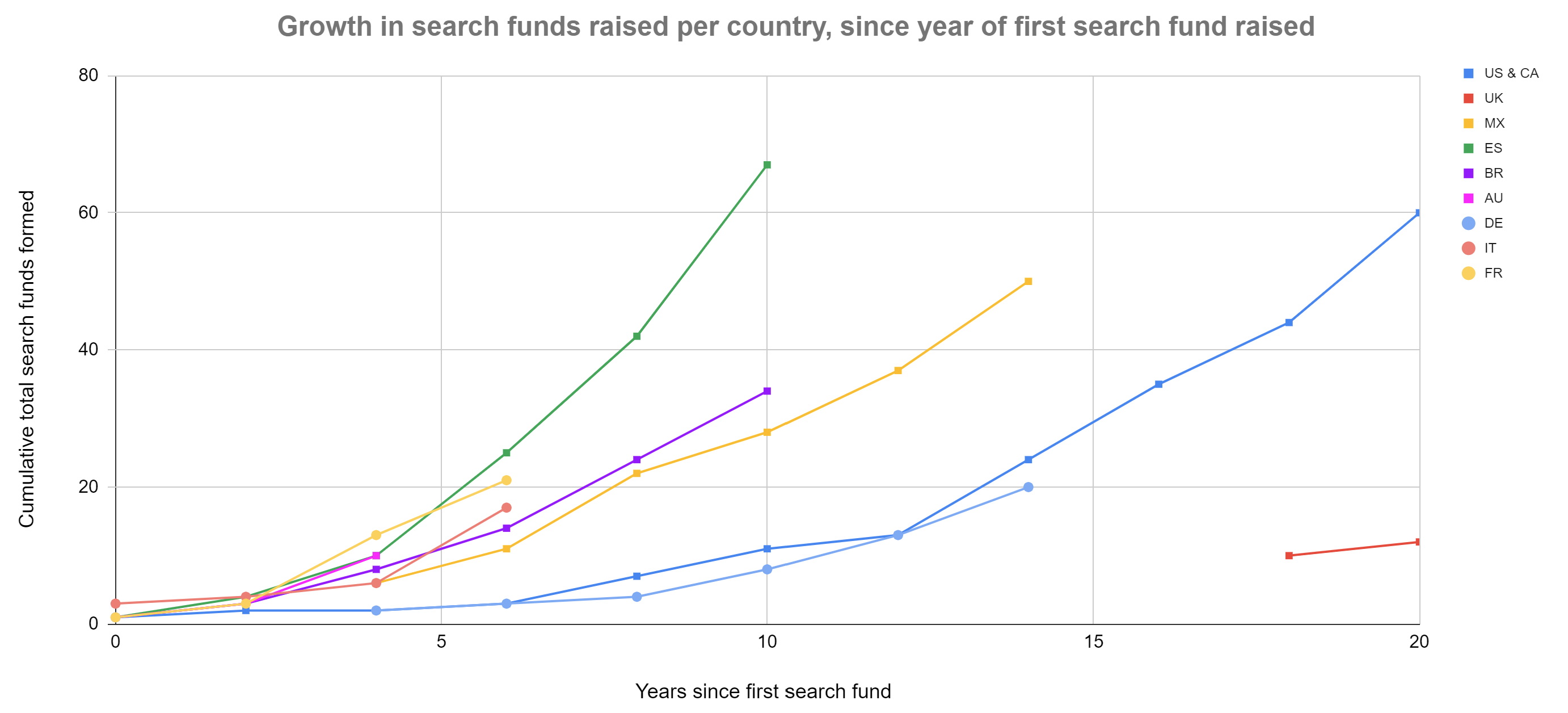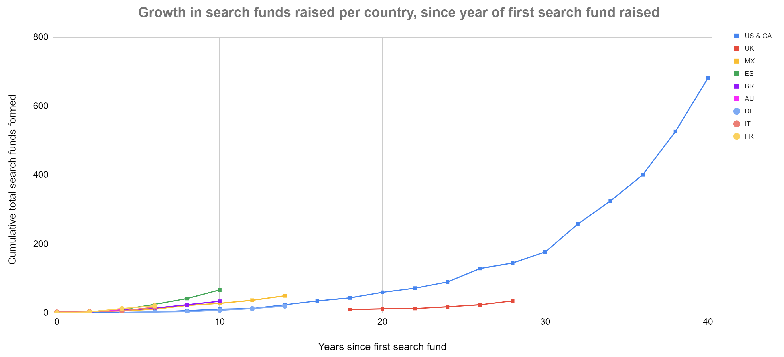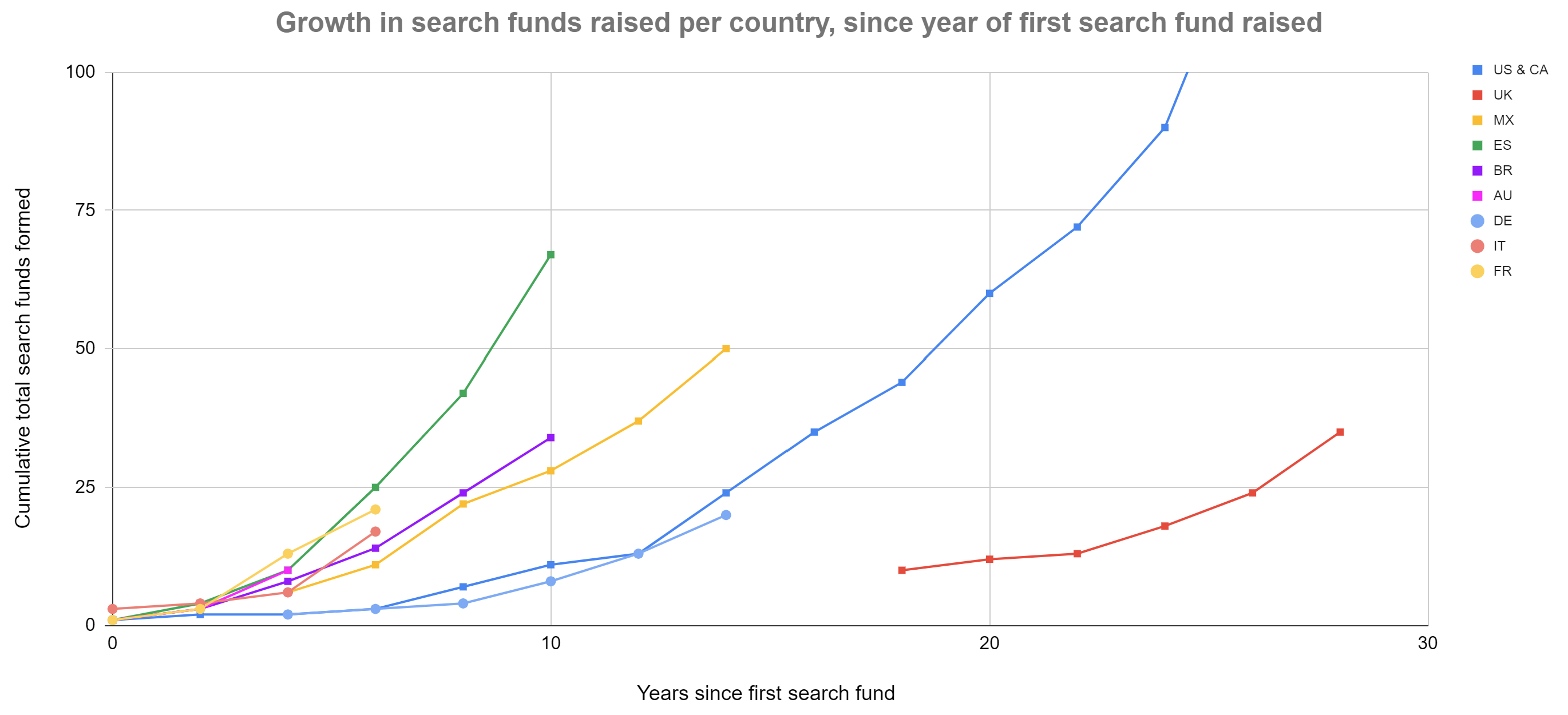 Almost all data is derived from the GSB and IESE studies, with a couple of missing dates sourced from searchfunder.com and google. The second and thrid graphs are just a zoom on the first, so that the data for countries other than the US & Canada is easier to read.