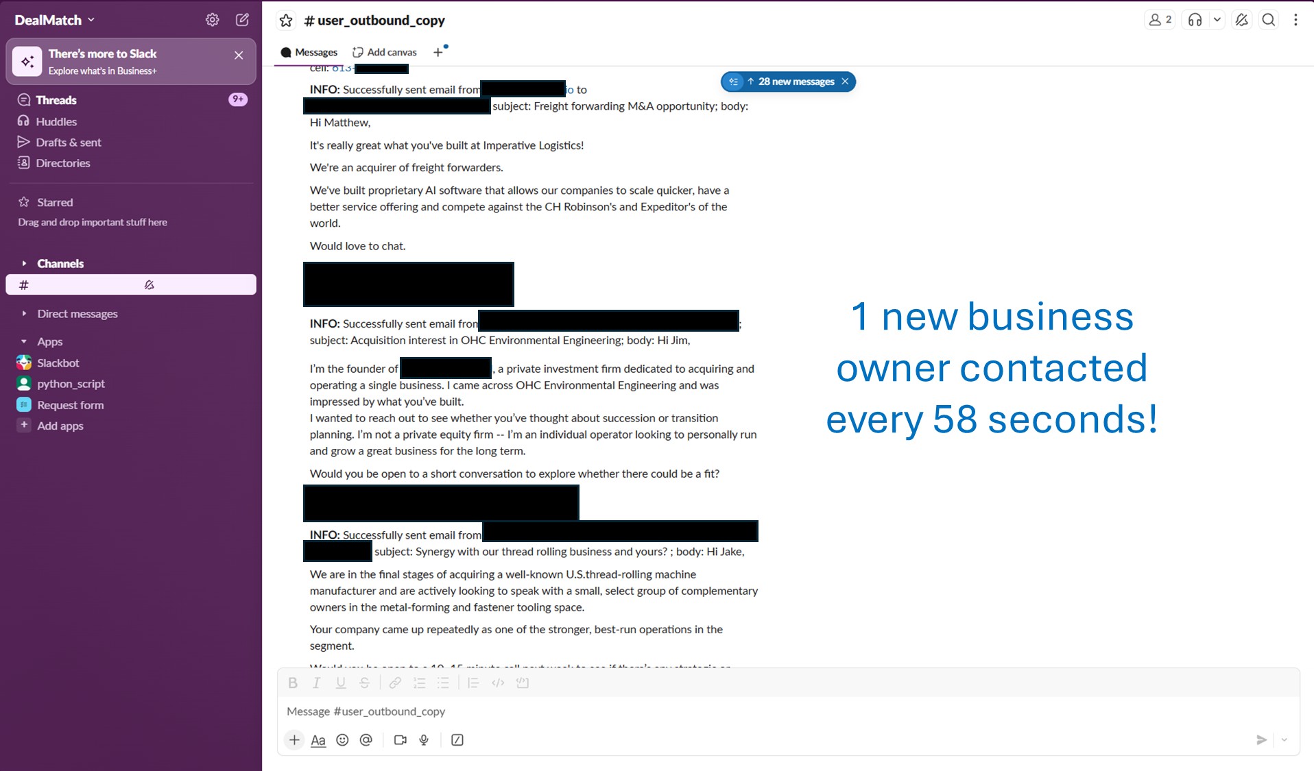 Outbound is live in DealMatch (launched Monday). 30 search funds have connected their inboxes, and across active campaigns we’re averaging 1 owner outreach email sent every 58 seconds.