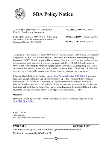 Thoughts? How will this change affect the current economy? As of March 1st even 1% of ownership by a non-citizen disqualifies a company from SBA loans. This includes legal permanent residents.