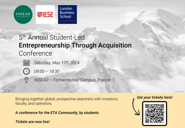 The Entrepreneurship Through Acquisition Clubs from INSEAD, IESE, and London Business School are excited to invite you to the 5th Annual Student-Led Entrepreneurship Through Acquisition Conference