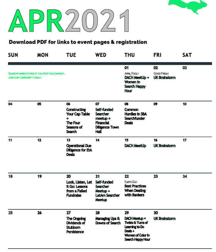 APRIL SEARCHFUNDER EVENTS CALENDAR