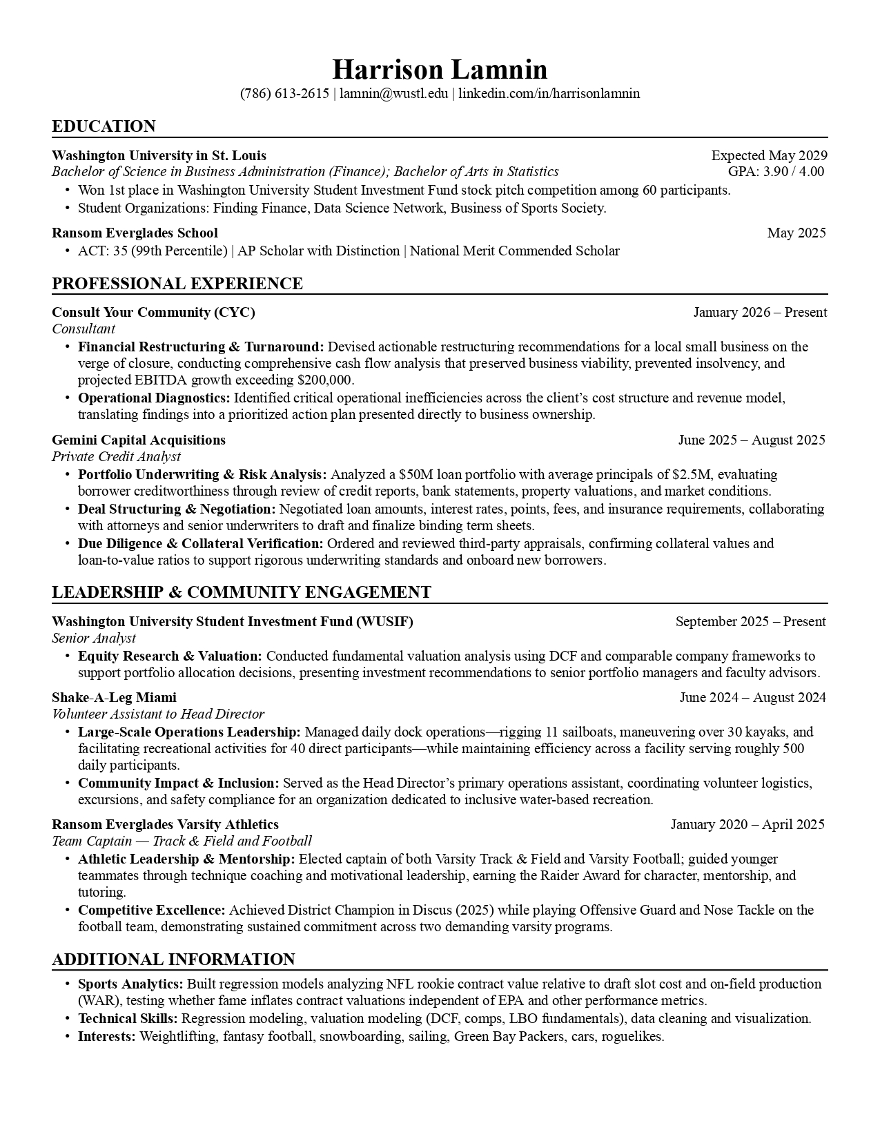 I'm mentoring a Finance & Statistics major, 3.90 GPA. He already has real deal exposure from a Private Credit Analyst role last summer in Miami (underwrote across a $50M loan portfolio, reviewed appraisals, helped negotiate term sheets). Also doing equity research in WashU's Student Investment Fund and financial restructuring consulting for a local small business.