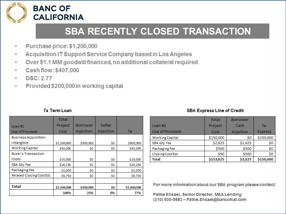 BANC OF CALIFORNIA SBA RECENTLY CLOSED TRANSACTION FOR SEARCHFUNDER