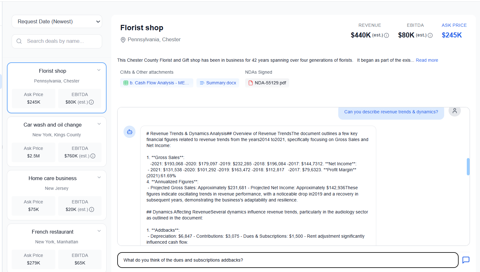 Think of it like having a deal analyst who builds pipeline and chases docs while you focus on deal evaluation.