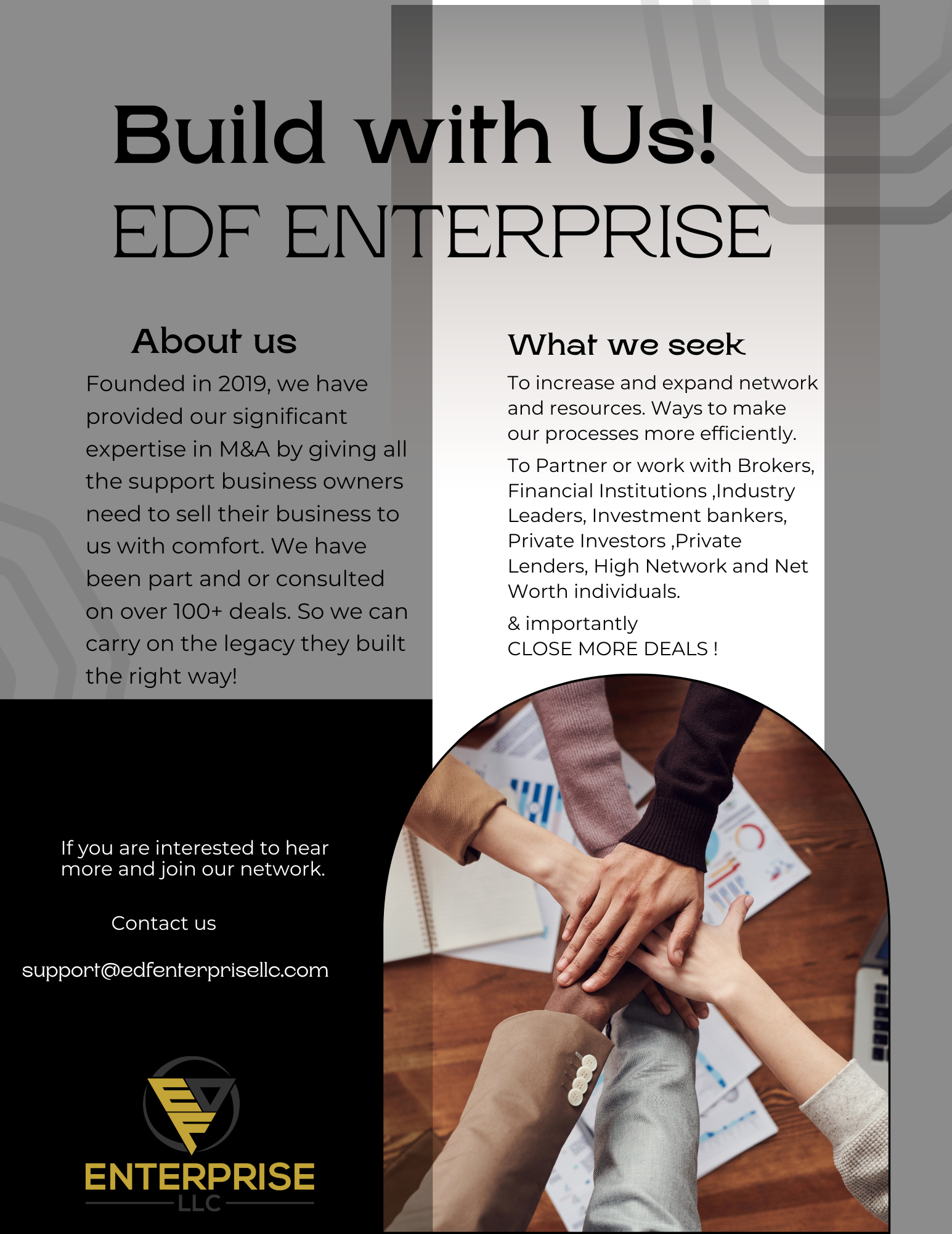 Strategic Partnerships: Aiming to partner with Financial Institutions, Industry Leaders, Investment Bankers, Private Investors, Private Lenders, High Net Worth Individuals, Angel Investors and other key players in the financial sector.