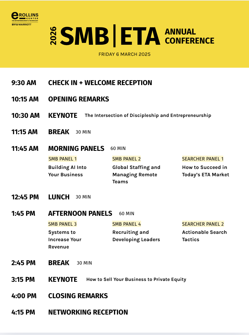 Hey everyone -- we're looking for a few more sponsors for the BYU ETA/SMB conference this year on March 6th. We get around###-###-#### attendees, mainly alumni that own/operate and acquire businesses. Not your typical student focused conference.