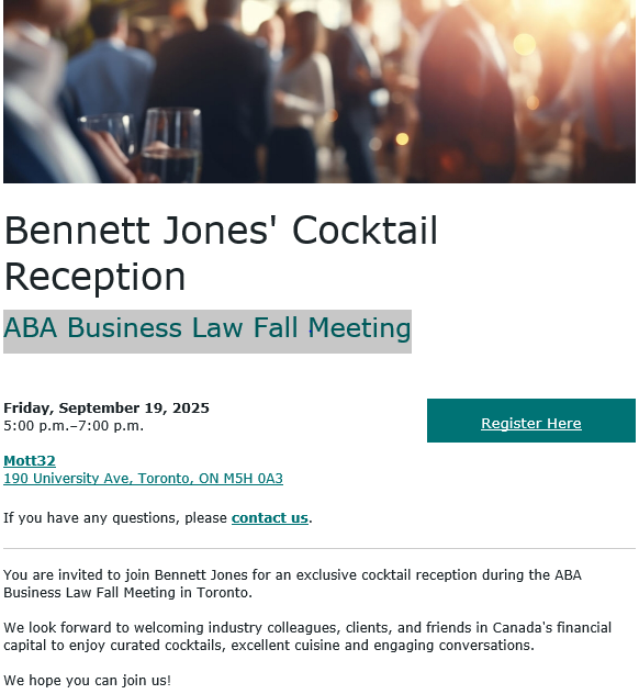 Calling all U.S. lawyers attending the ABA Business Law Fall Meeting in Toronto next week! Bennett Jones is hosting a cocktail reception on Friday, September 19, 2025, and we’d love to see you there. If you're interested in joining us, feel free to DM me for RSVP.
