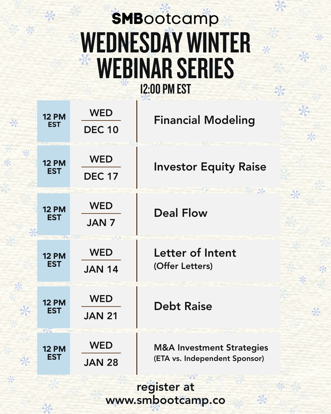 Details of the Wednesday Winter Webinar Series by SMBootcamp