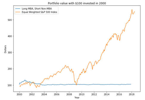 For an initial test of our first hypothesis, we formed monthly portfolios that go long companies with MBA CEOs and short companies headed by non-MBAs. Figure 1 below displays the outcome next to an equal-weighted S&P 500 index from 2000 to 2018.