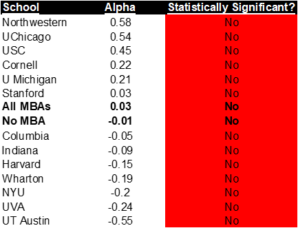 The perceived quality of each institution appeared to have no correlation with stock price returns. Northwestern led with an alpha of 0.58% per month. Stanford eked out a barely positive alpha of 0.03% per month. Harvard and Wharton had negative alphas of -0.15% and -0.19%, respectively, per month. While these rankings likely occurred by sheer chance, they do nothing to support Jensen’s thesis.