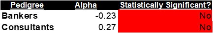 Neither bankers nor consultants produced statistically significant alphas. We also backtested portfolios designed to favor ex-bankers and consultants and found no significant edge.