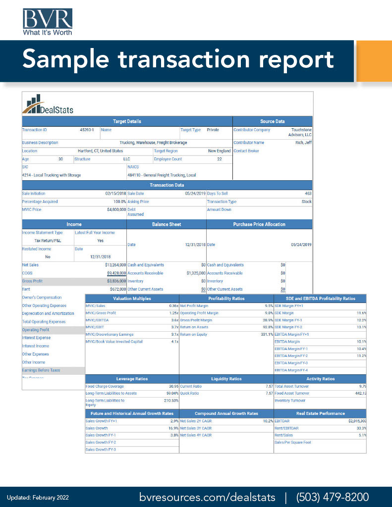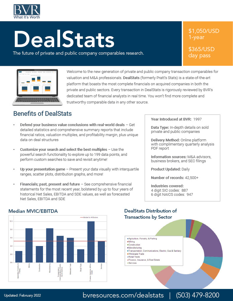 For the last two years Searchfunder has partnered with Business Valuation Resources (BVR) to provide summary statistics and sample transactions. If you're not already using BVR on Searchfunder, you can find it under the VALUATIONS tab at the top of this page. Here is the direct link: www.searchfunder.com/bvr