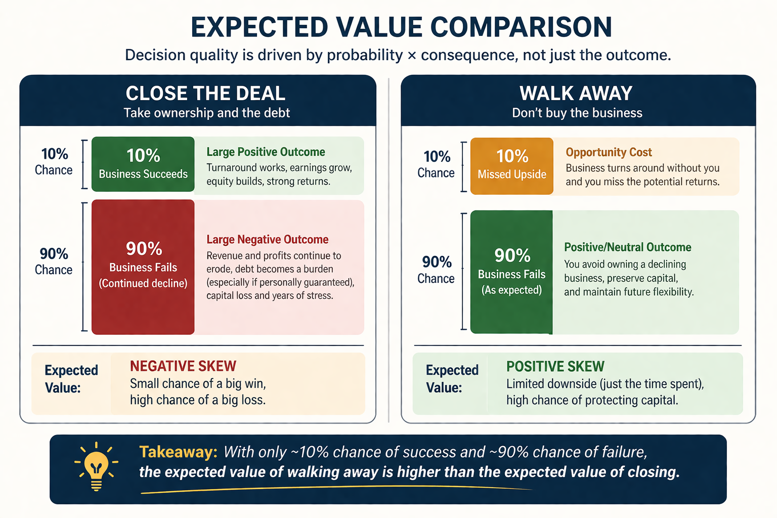 By this point in the process, the costs that have already been incurred are real and immediate. Meanwhile, the risks that are being avoided are hypothetical and less tangible. Regardless, the most relevant comparison is not between closing and walking away as isolated events; it is between walking away now and owning a business that may not be able to support its debt over time.