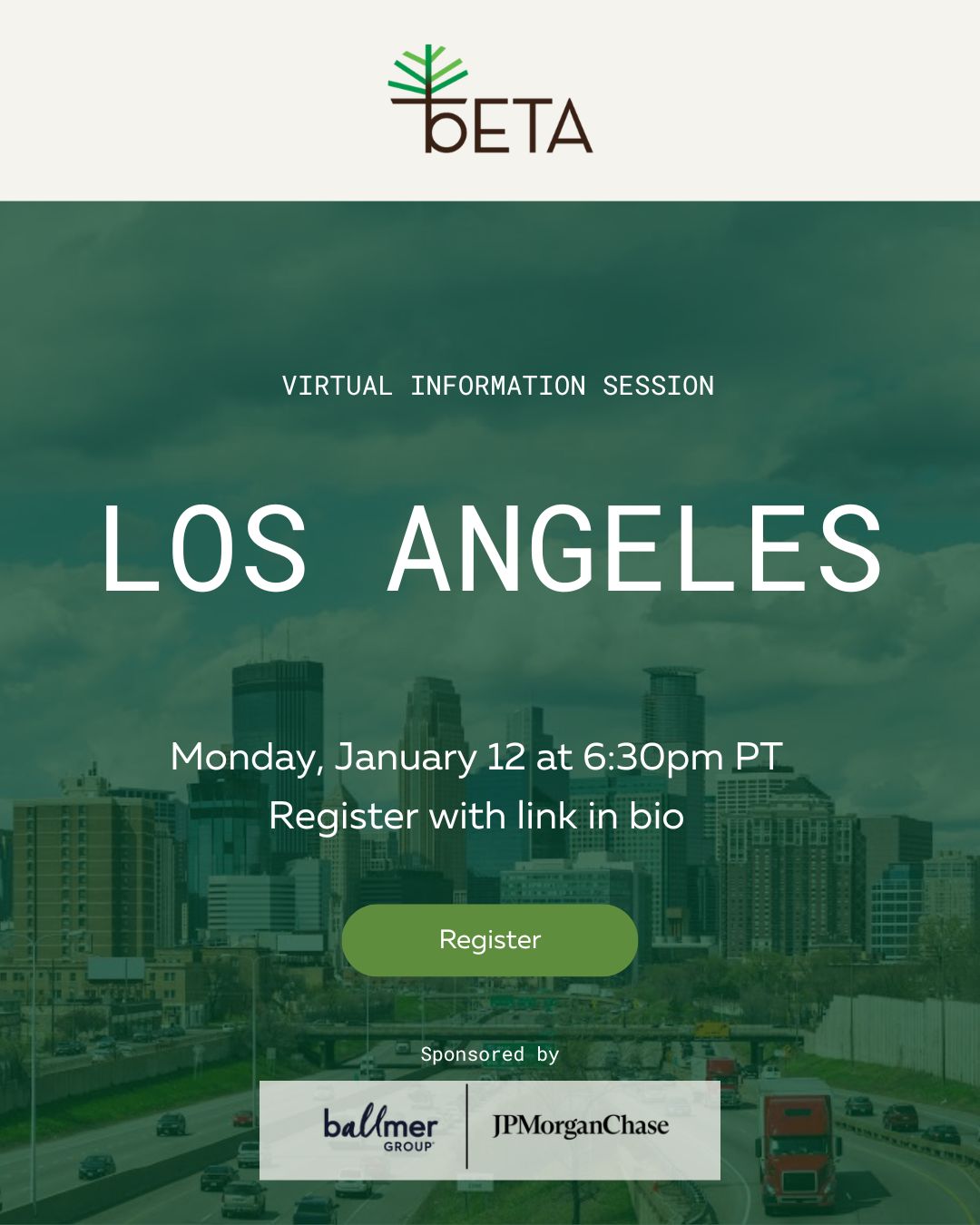 New Majority Capital’s 10-week accelerator, bETA, launches in Los Angeles in March to support underrepresented entrepreneurs interested in buying a small business. RSVP for the virtual info session on Monday, January 12th at 6:30pm PST. Register here: https://zoom.us/j/###-###-#### ?pwd=TcPZ8fs8TwaVb9DL8XLI500d8sKG2k.1 Applications open right after the session.