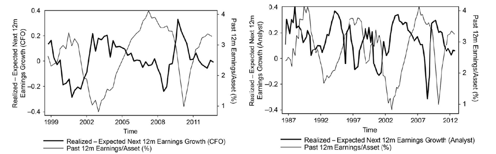 The biggest errors in expectations—and thus investment decisions—come after very negative recent experiences, when investors are far too pessimistic and make massive forecasting errors. The next two tables show aggregate CFO expectations about next-12-month earnings growth against past-year corporate profitability on the left, and the same series using analysts’ expectations data on the right.