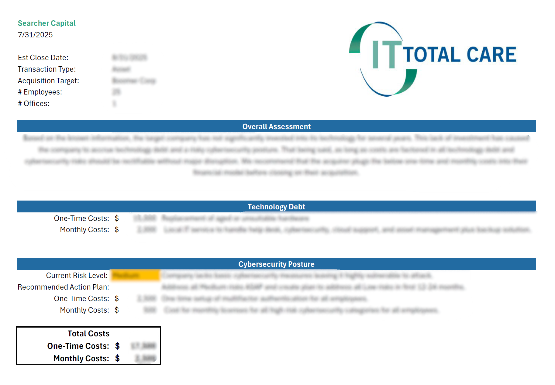3) Estimates for what it would cost post-close to fix issues and get to a clean, secure baseline.