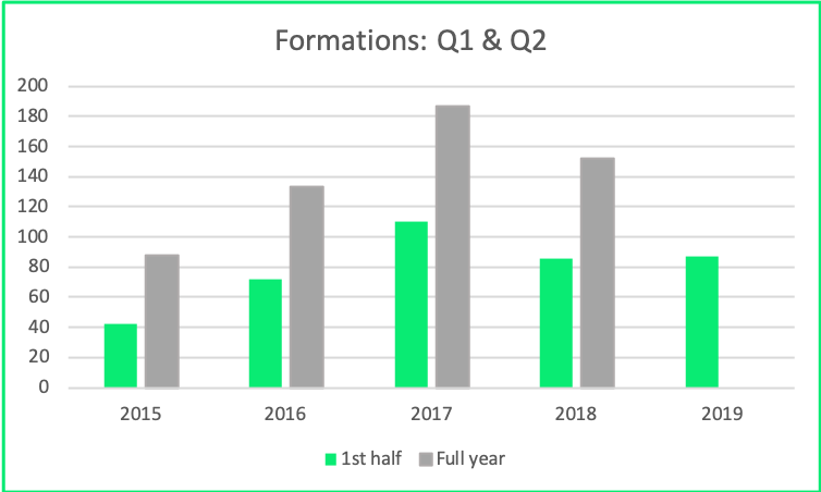 In our last report six months ago, the data indicated that there was a dip in search fund formations between 2017 and###-###-#### That is still holding, although the gap has narrowed considerably. Below is a chart with the data for the first half of###-###-#### As there is a lag between a dealing closing and when it's reported to Searchfunder, we believe that formations for 2019 for the full year are likely on pace with or slightly higher than last year's.