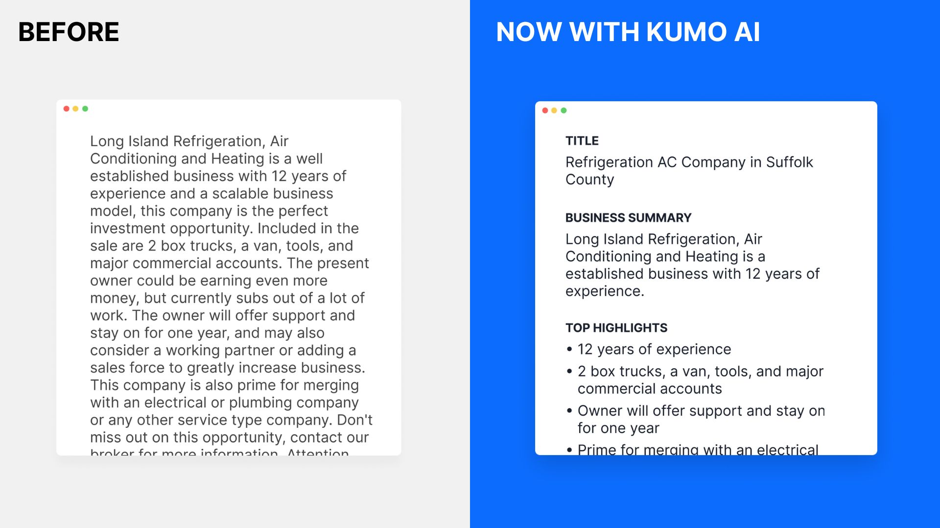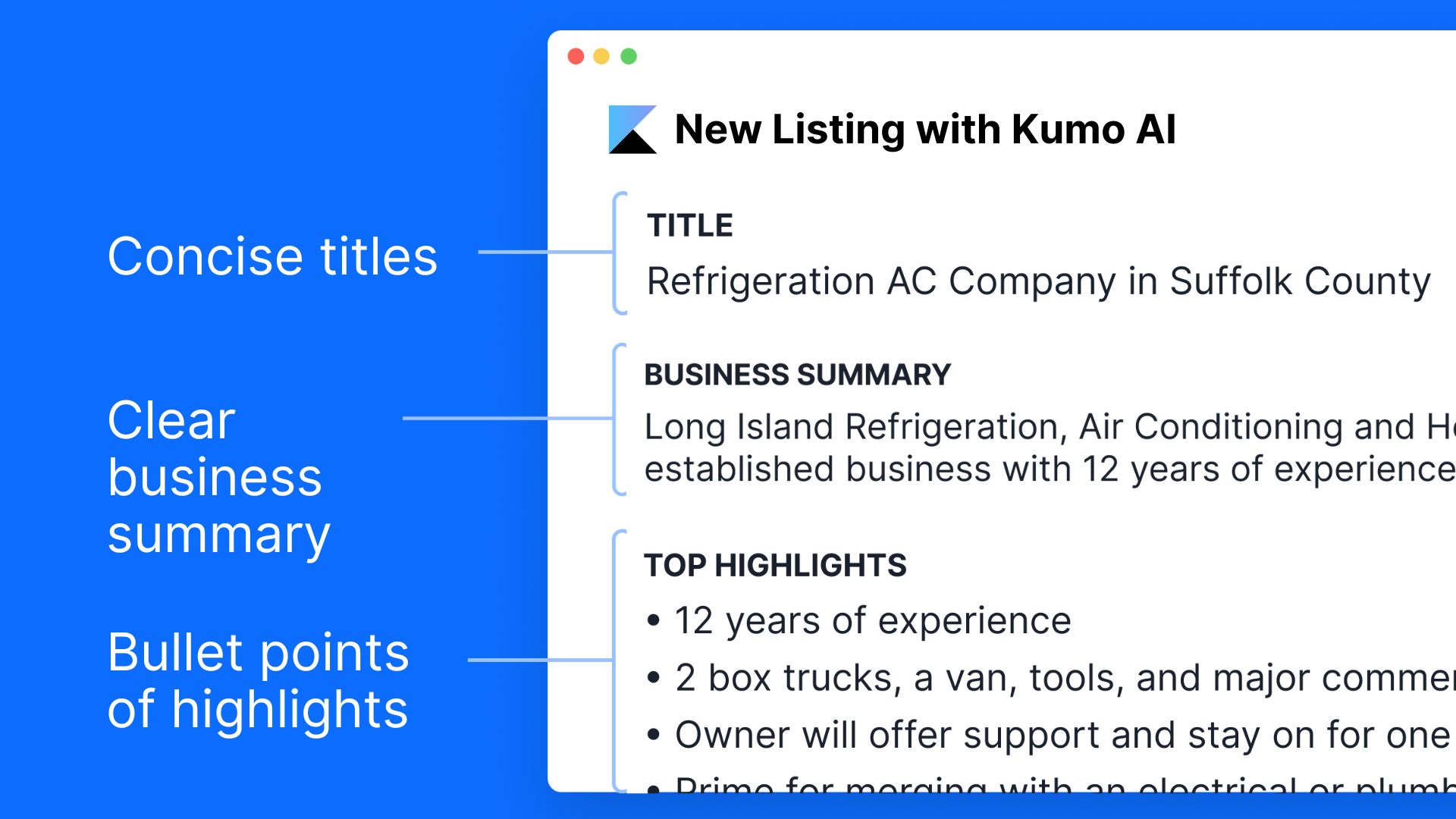 We see a lot of businesses for sale out on withkumo.com (more than 120,ooo deals!) and frankly, a lot of listings are hard to read. Most listings out there are vague, jargon-heavy, and full of fluff. That's why we launched AI-powered business listings, with: