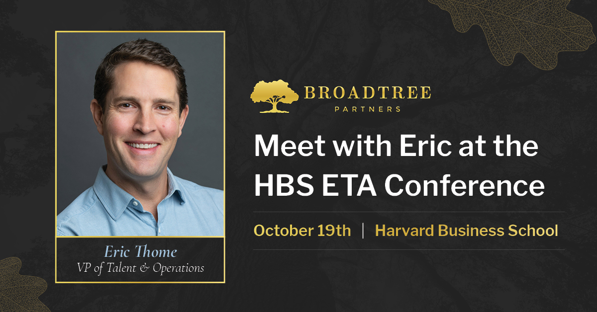 Broadtree Partners’ Vice President of Talent & Operations, Eric Thome, will attend the upcoming Entrepreneurship Through Acquisition (ETA) Conference at Harvard Business School! We look forward to connecting with everyone at the conference and learning about the latest trends in acquisition and growth.