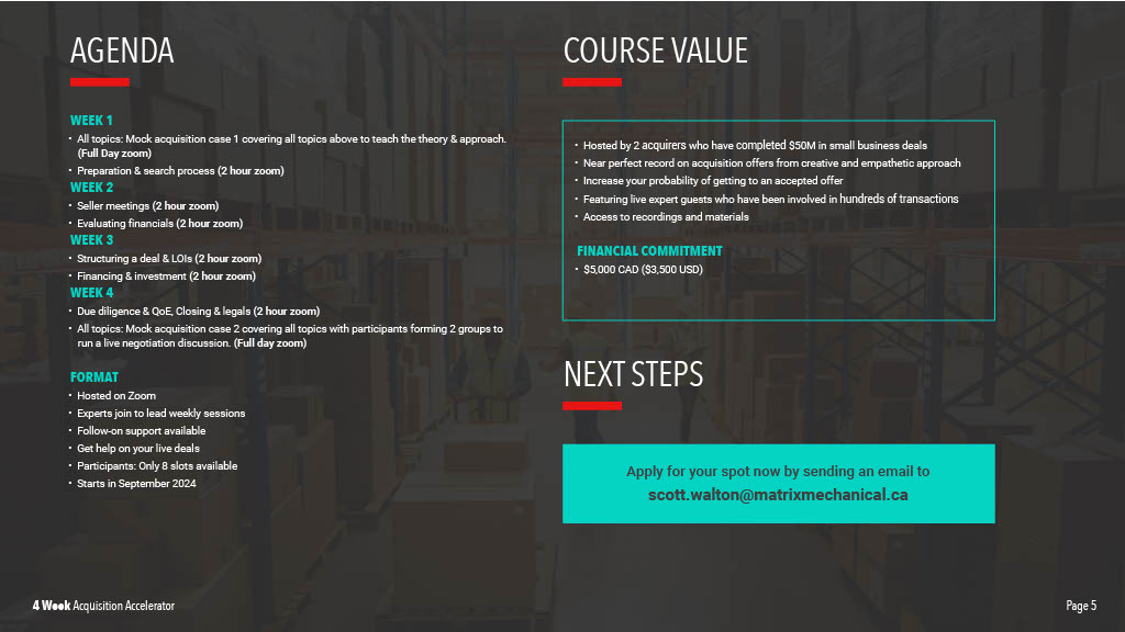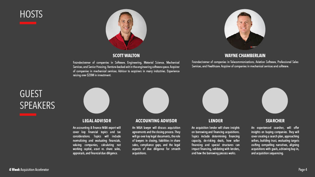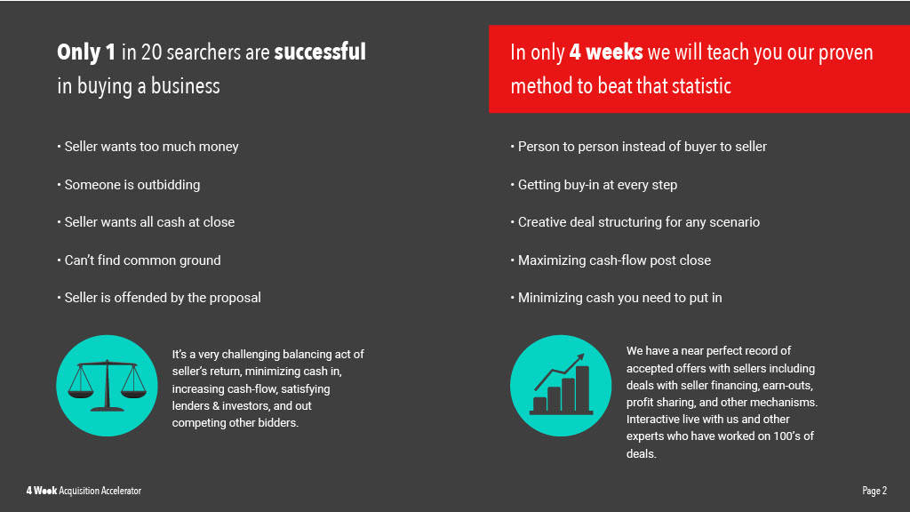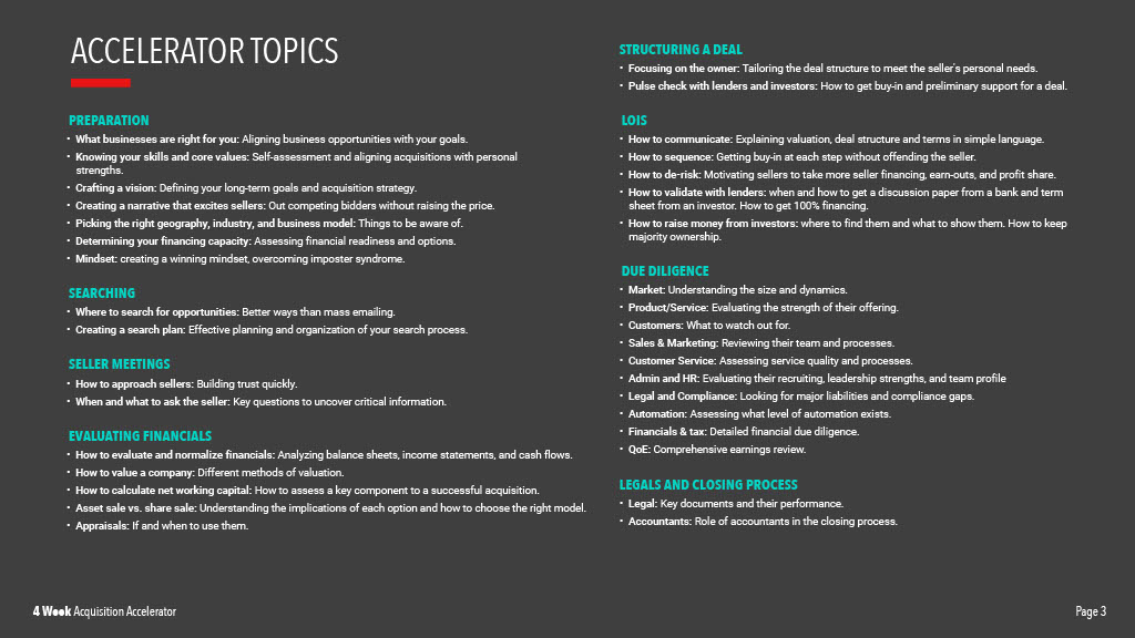 Hosting a 4 week online accelerator on acquiring companies, with a focus on creative deal structures