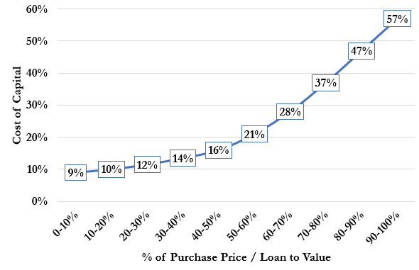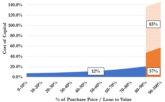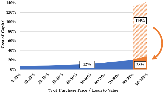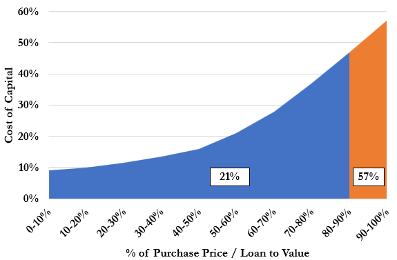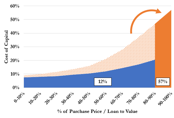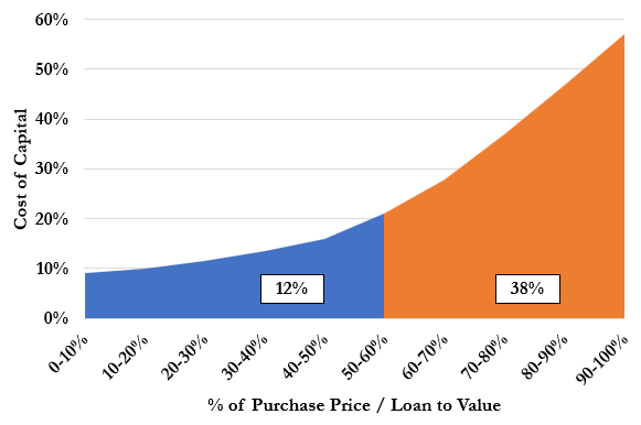 Most commercial lenders consider 50% loan to value a prudent advance rate. Above that the risk starts increasing faster. If we combine the first 50% of capital in the example above, we get a yield of 12%. This is a typical bank loan (provide $2mm of the $4mm needed for the transaction at 12% interest).