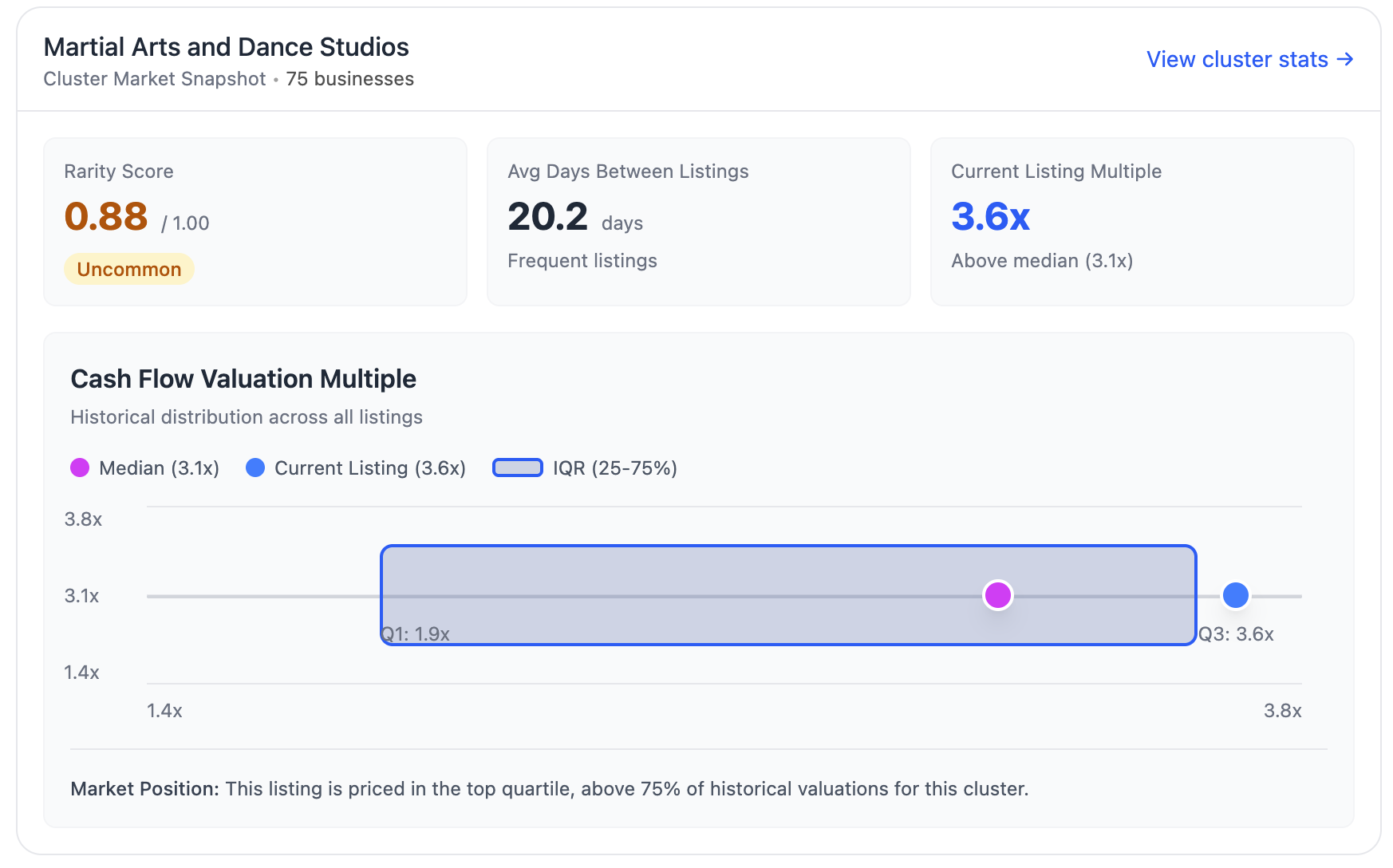 When you open a listing, you can now see how it compares to its actual peers (e.g., martial arts studios trading at a median 3.1x cash flow multiple), along with historical trends for that specific niche.