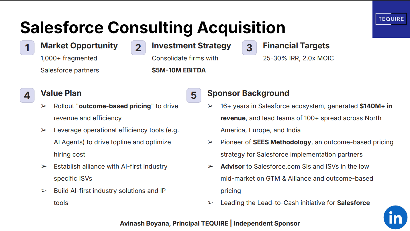 I am an independent sponsor focused on acquiring Salesforce IT consulting businesses within the United States.