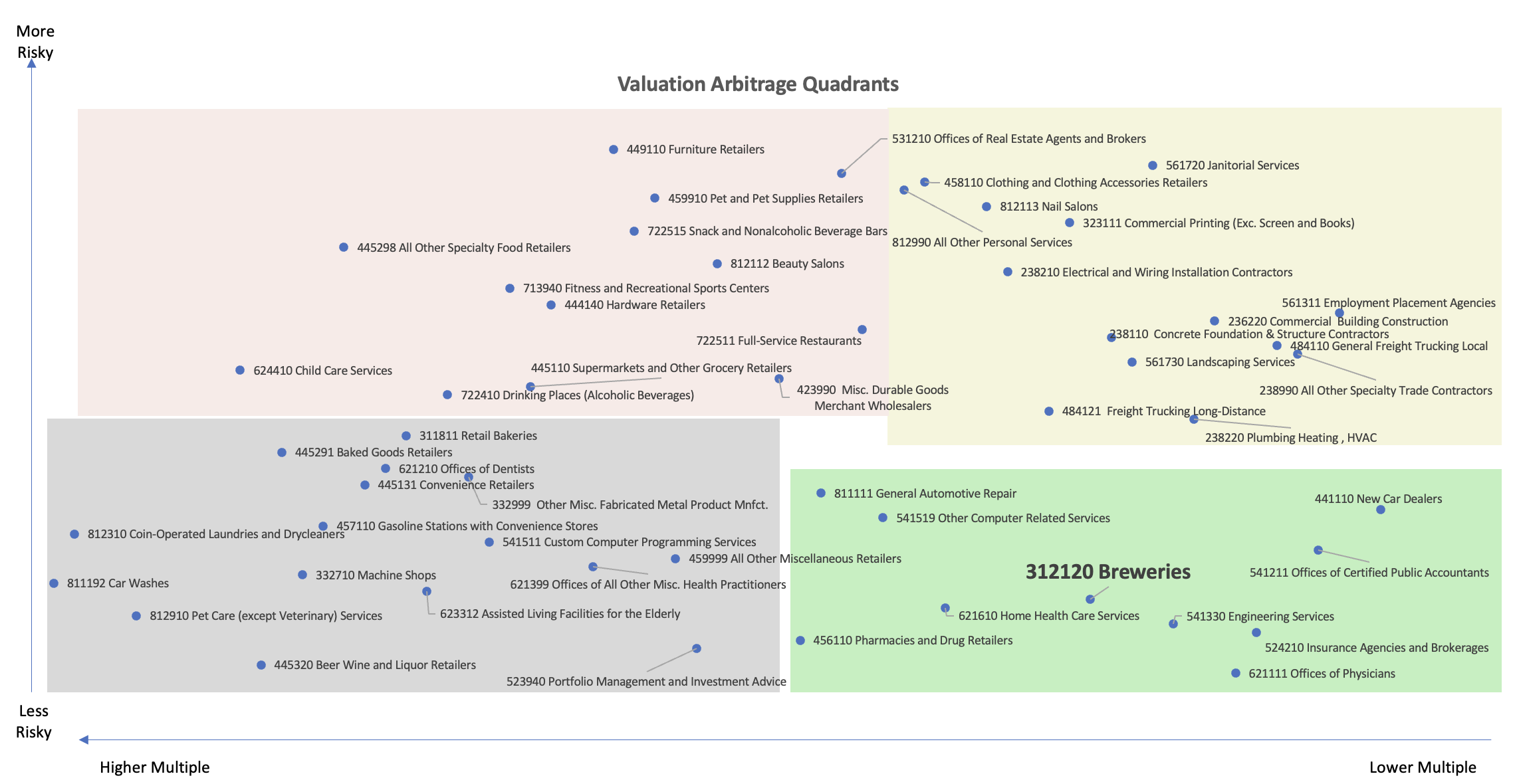 also color coded industries like Pet Care, Lessors of miniwarehouses and non-casino hotels and motels, but having them on the “good quadrants" of both sides in the equation also means they don’t have that much arbitrage - they are not risky, and they are priced accordingly.