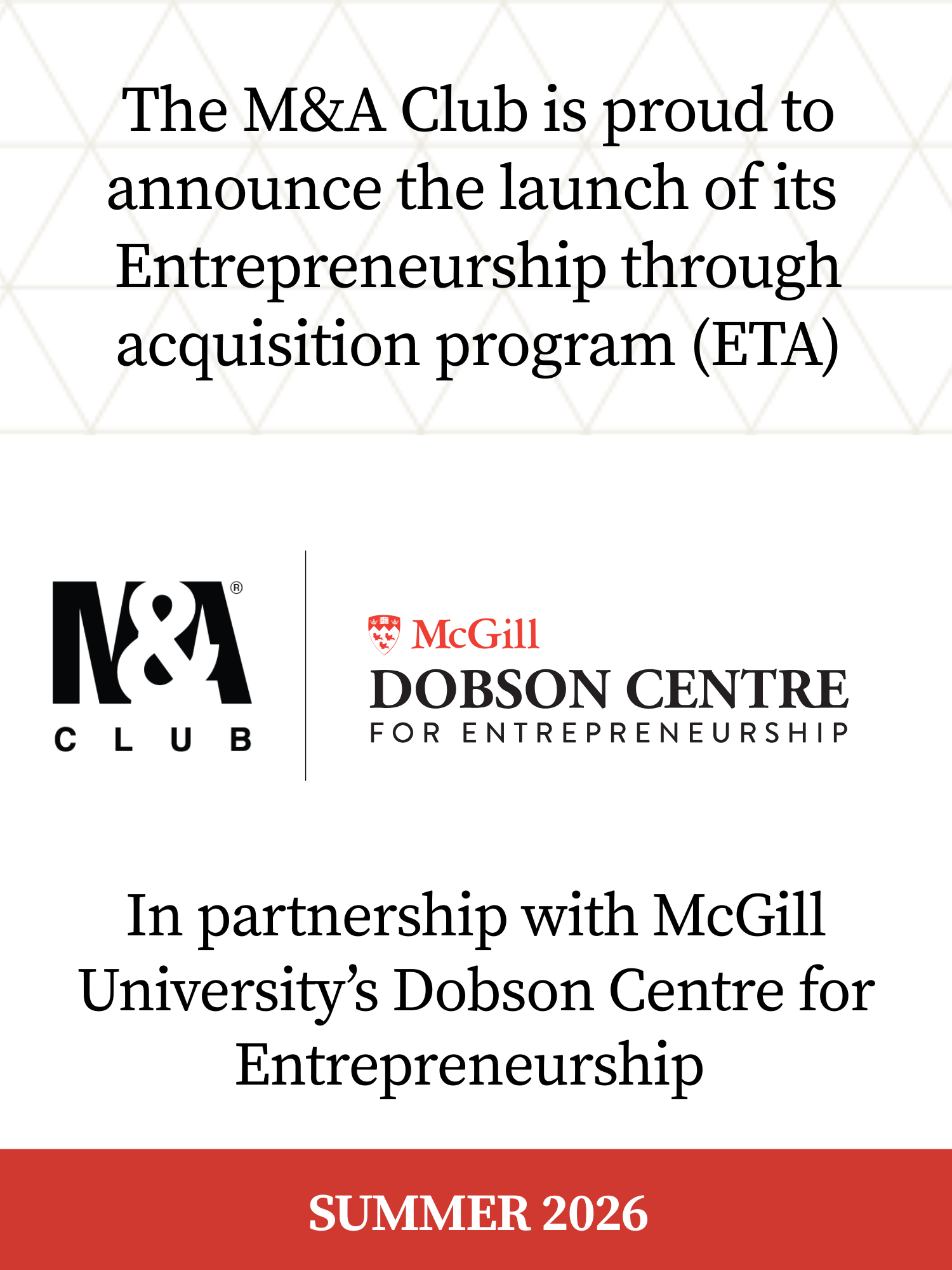 Happy to share that the M&A Club of Canada has partnered with McGill University's Dobson Centre for Entrepreneurship to launch a new open-market ETA program. First cohort starts Summer 2026.