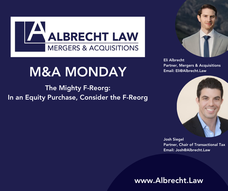 This M&A Monday is co-drafted and posted with Joshua Siegel, Partner and Chair of Transactional Tax Group at Albrecht Law because he is the tax genius and expert on F-Reorgs and all things-tax.