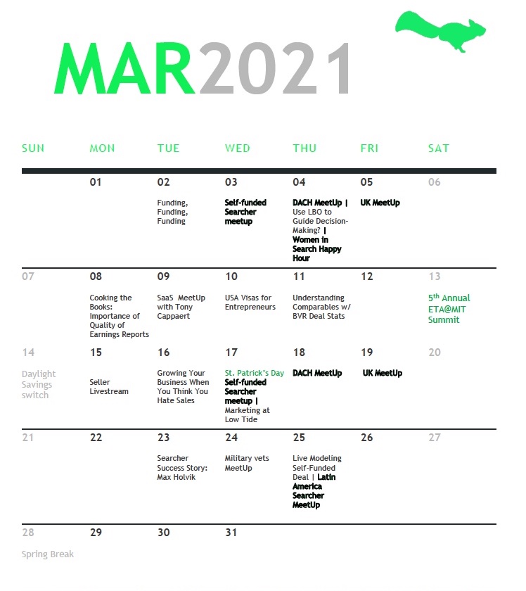 Last month, we kicked off meetups for self-funded searchers, DACH searchers and Latin American searchers. Searchers found the meetups to be so helpful that they are now recurring sessions. This month, we launch our first meetups for SaaS searchers and our military veterans. For these meetups, please come prepared to speak or chat with your fellow searchers,. Don't worry about the usual atmospherics of your "office mates," such as spouses/partners/roommates, dogs, cats, kids, elders, and delivery doorbells.
