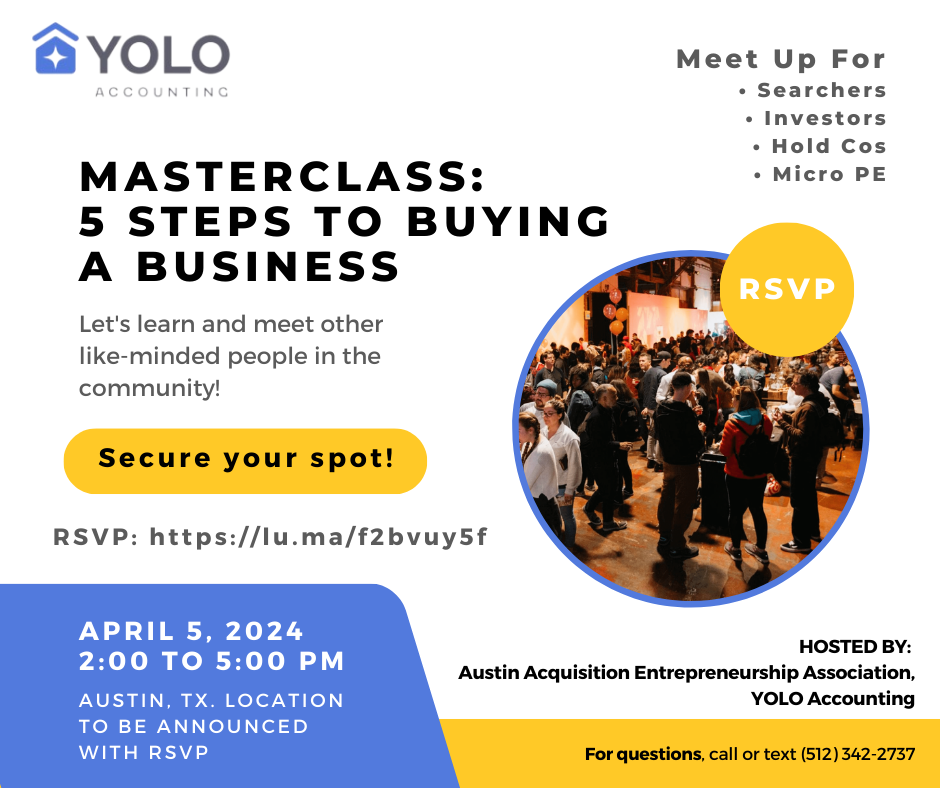 **Want Insider Secrets To Buying Businesses?** Then join us on April 5th from 2pm-5pm for the Austin Acquisition Association Masterclass and Networking.