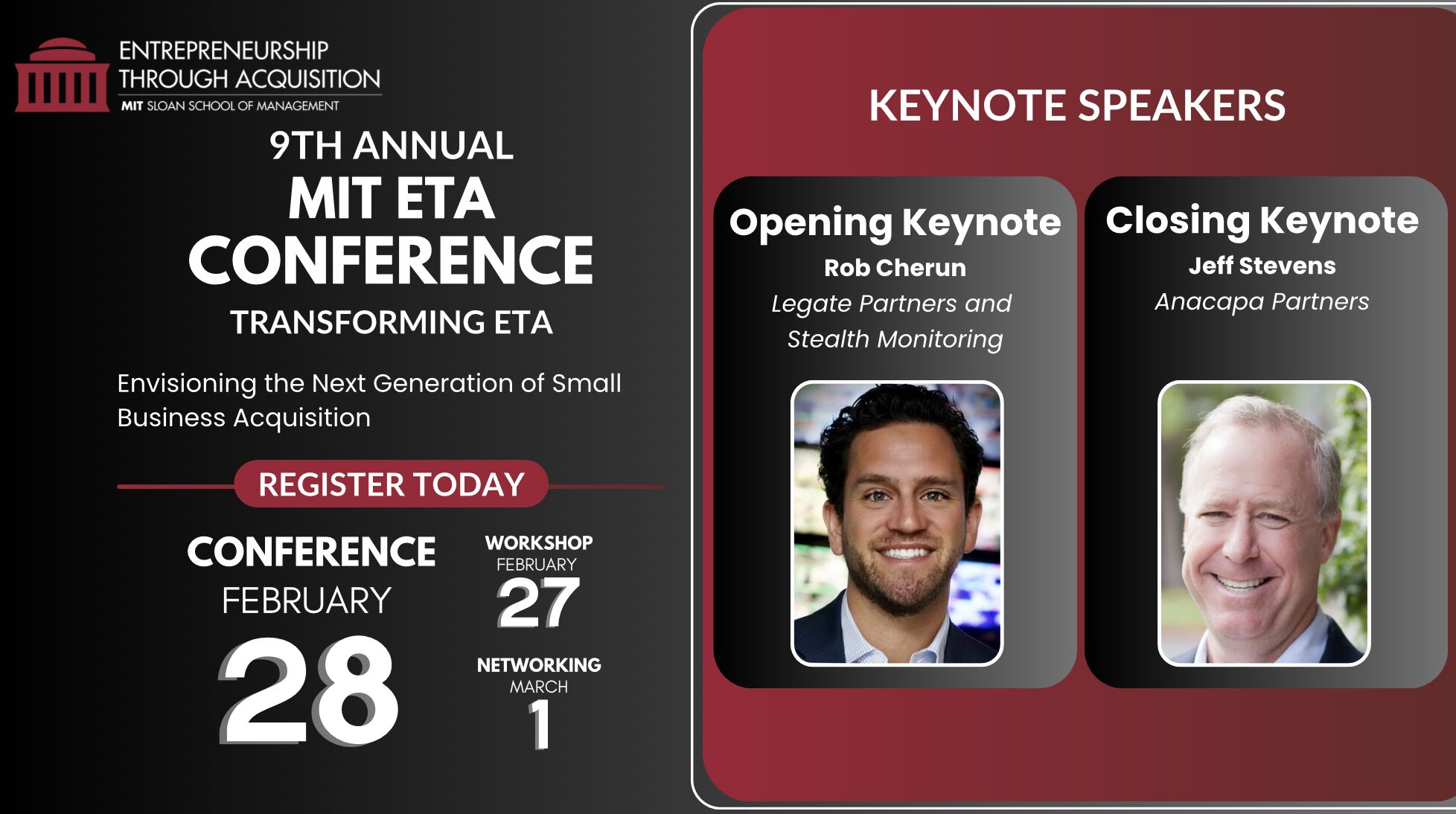 The ETA@MIT Conference is just around the corner, and we’re thrilled to announce our keynote speakers, who bring unparalleled experience from both sides of the search fund journey.
