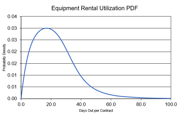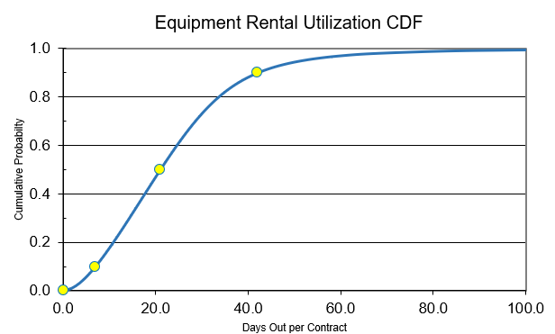As an illustration, let's say our pairs, i.e., "days out per contract" by "percent of time", reflect the expert's opinions, as follows: (7 days or less, 10%) as worst; (21 days or less, 50%) as base; and (42 days or less, 90%) as best case. Next, I would run these pairs through a fitting algorithm [See Note 4]. As a result, we, now, have a much better representation and distribution for equipment utilization as probabilities of rental days out per contract.