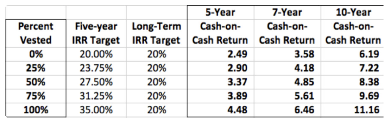 My intention in adopting this new formulation is to simplify the calculation of performance equity, to focus on the consensus measure of success, and to shift everyone's focus to a hold period of five years or more, as this allows sufficient compounding to reach the goal. I am posting the MOIC returns required under my prior formulation below just for comparison purposes.