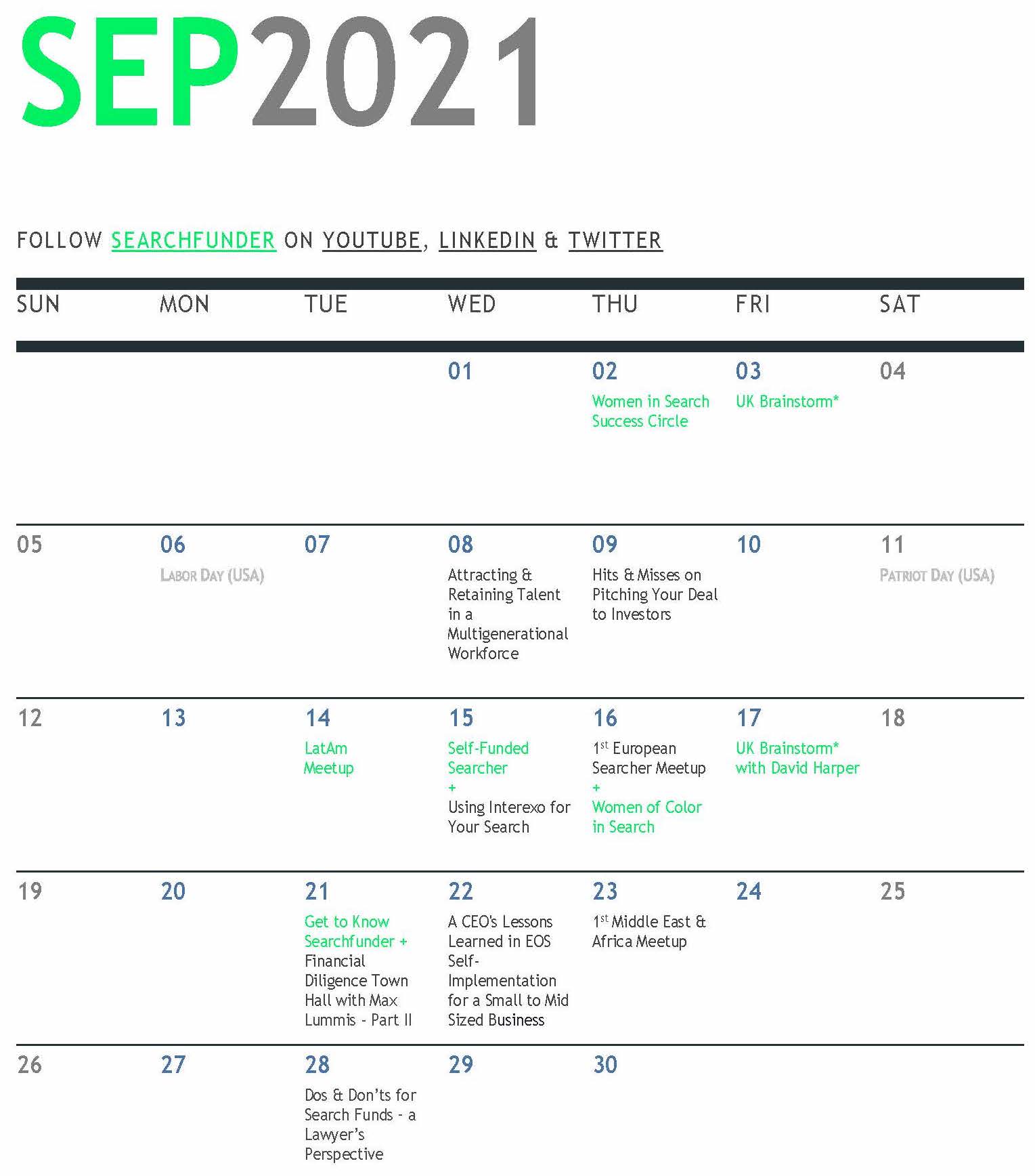 In September, our sessions have both depth and breadth. For depth, we'll cover topics to help searchers who are just starting out, already have a few LOIs under their belt or are looking to grow their acquired business. For breadth, we host our first ever European Searcher meetup and Middle East & Africa search community meetup along side our offerings for Latin America, the UK, women, women of color and self-funded searchers. Speaking of women searchers, our Women in Search Success Circle will discuss A.J. Wasserstein's recent case note tomorrow. Please help spread the word to women who may be interested.