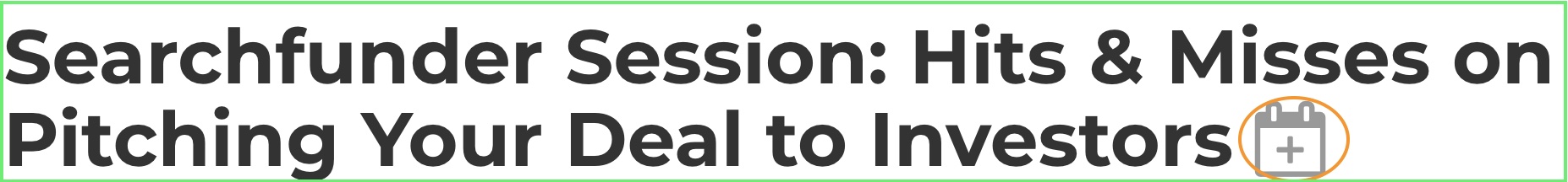 Our Searchfunder, S.O.S. and Searchfunder Meetup sessions are offered at no additional charge to the members of our community. Our members should always register through the Searchfunder events calendar,