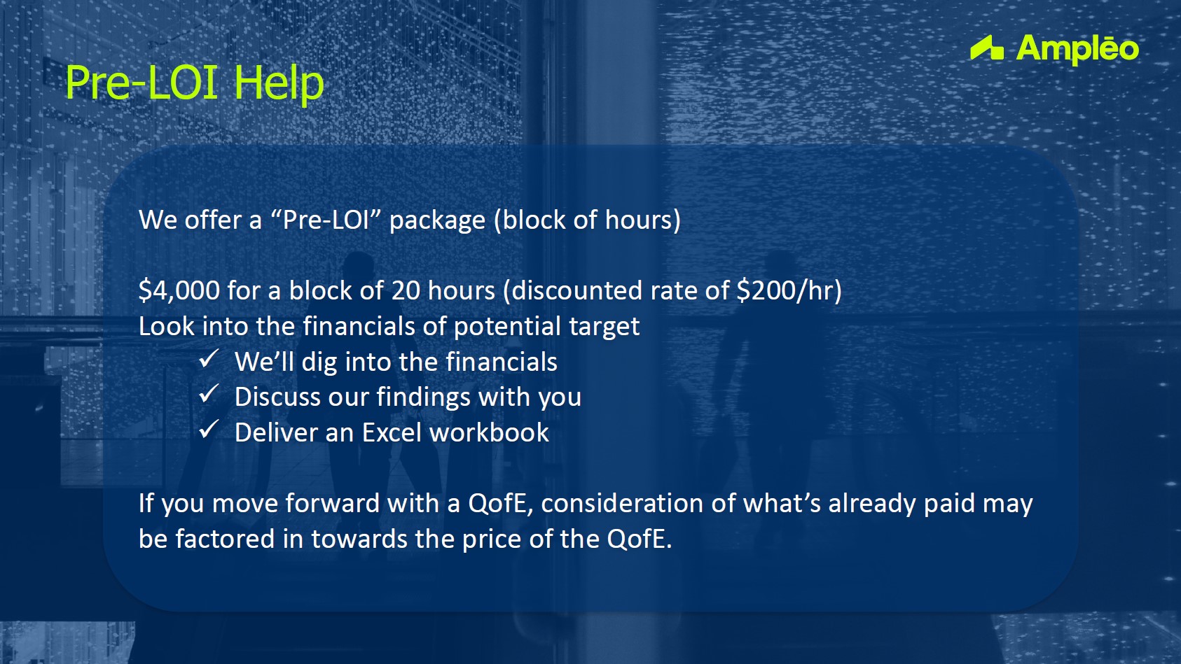 If you decide to move forward with a deal that we've helped you dig into, and it's determined that a Quality of Earnings (QfoE) is needed, then consideration of what you've already paid for the Pre-LOI engagement may be factored into the price of the QofE.