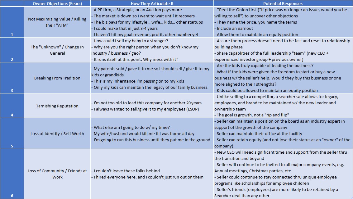 Thought I'd share it w/ the group to get everyone's thoughts / feedback / ideas. I've personally seen all six of these objections from owners (often multiple ones from the same seller), and I've heard many of the lines in the second column. And I've tried many of the responses w/ varying levels of success. What worked best for you?