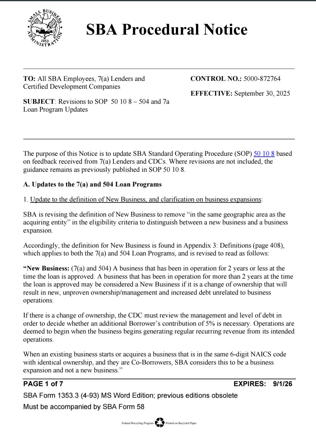 Big news for business owners and entrepreneurs. On September 30th, the SBA released Procedural Notice###-###-#### that makes it easier to access 100% financing on *add-on* acquisitions under the SBA 7(a) program.
