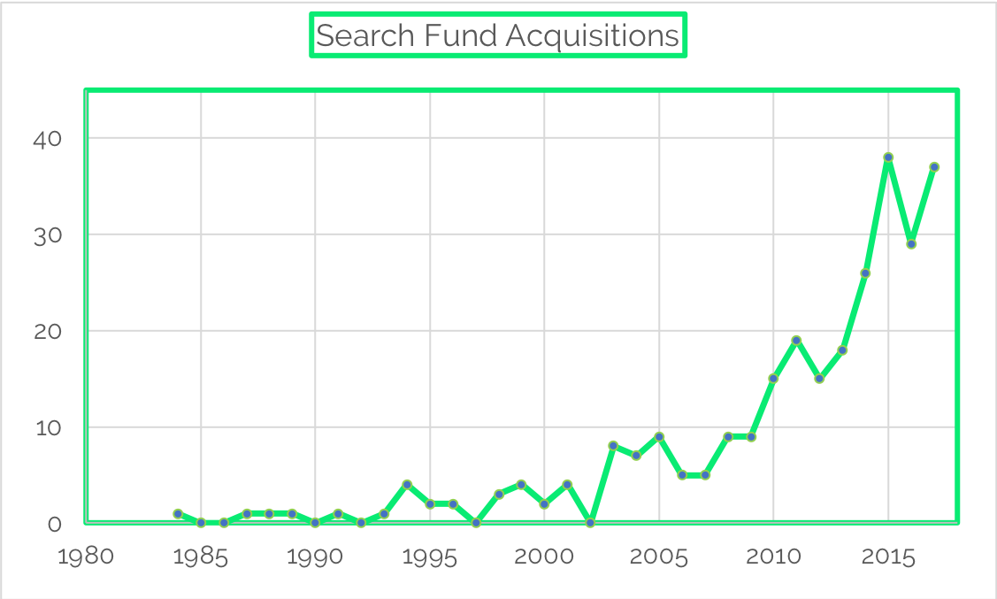 Search fund formations continued their upward trend in###-###-#### Over the last 5 years, the average annual growth rate is a tad over 40% and over the past 10 years at 25%. For search fund acquisitions, the average annual growth rate has kept pace with formations over the last 10 years, coming in at 27%. For some reason, acquisitions dipped in 2016, but rebounded in 2017 toward 2015 levels. This dip causes a drops in the 5 year average growth rate, which resides at 16%.