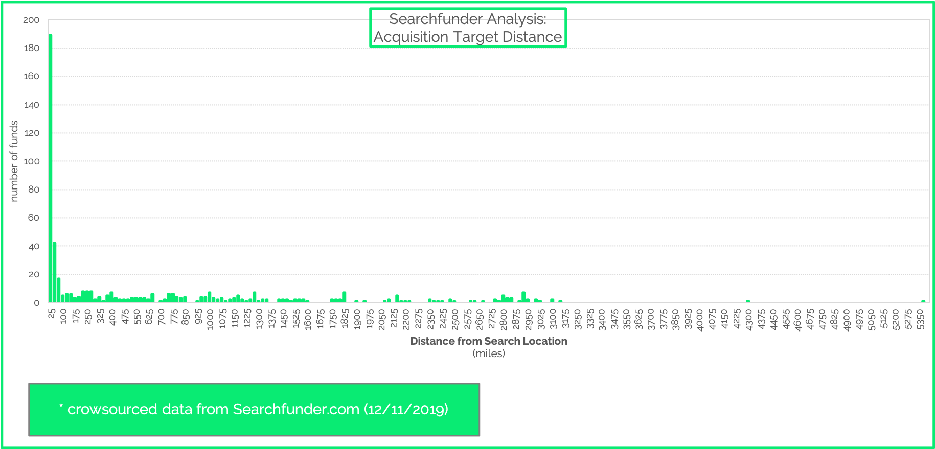 30% of search funds find a target in the same area as their search location. The median distance for all known search acquisitions is 60 miles and within a 2 hour drive. The average is pulled up by a host of cross country acquisitions. (The longest distance comes in at a whopping 5350 miles). Thus, the average is 600 miles with a drive time within 9 hours . Essentially, 600 miles is the distance from Portland, Oregon to the California Bay Area or New York City to Charlotte -- both are about 2 hour flights. This indicates to us that the average location is likely to be found within a convenient day trip -- either by car or plane -- from the search location.