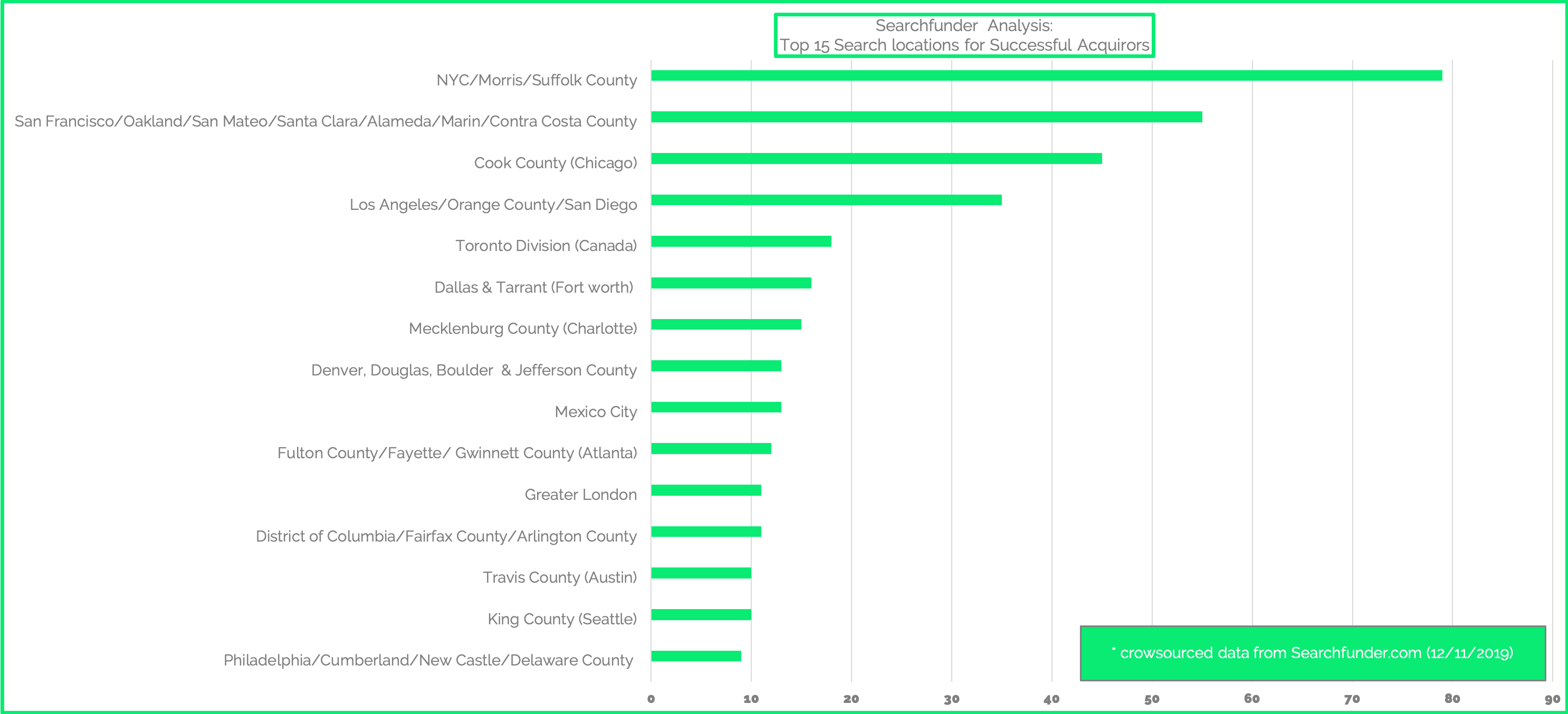 We further assessed the most popular places from where successful searchers conduct their search. The below chart includes only those search funds that have acquired a company. As you'll see, New York City with its 5 burroughs topped the list followed by the San Francisco Bay Area. The San Francisco Bay Area covers a fairly large swath from Santa Clara to Marin and Contra Costa Counties. However, San Francisco County by itself would land within the Top 5 of our list.