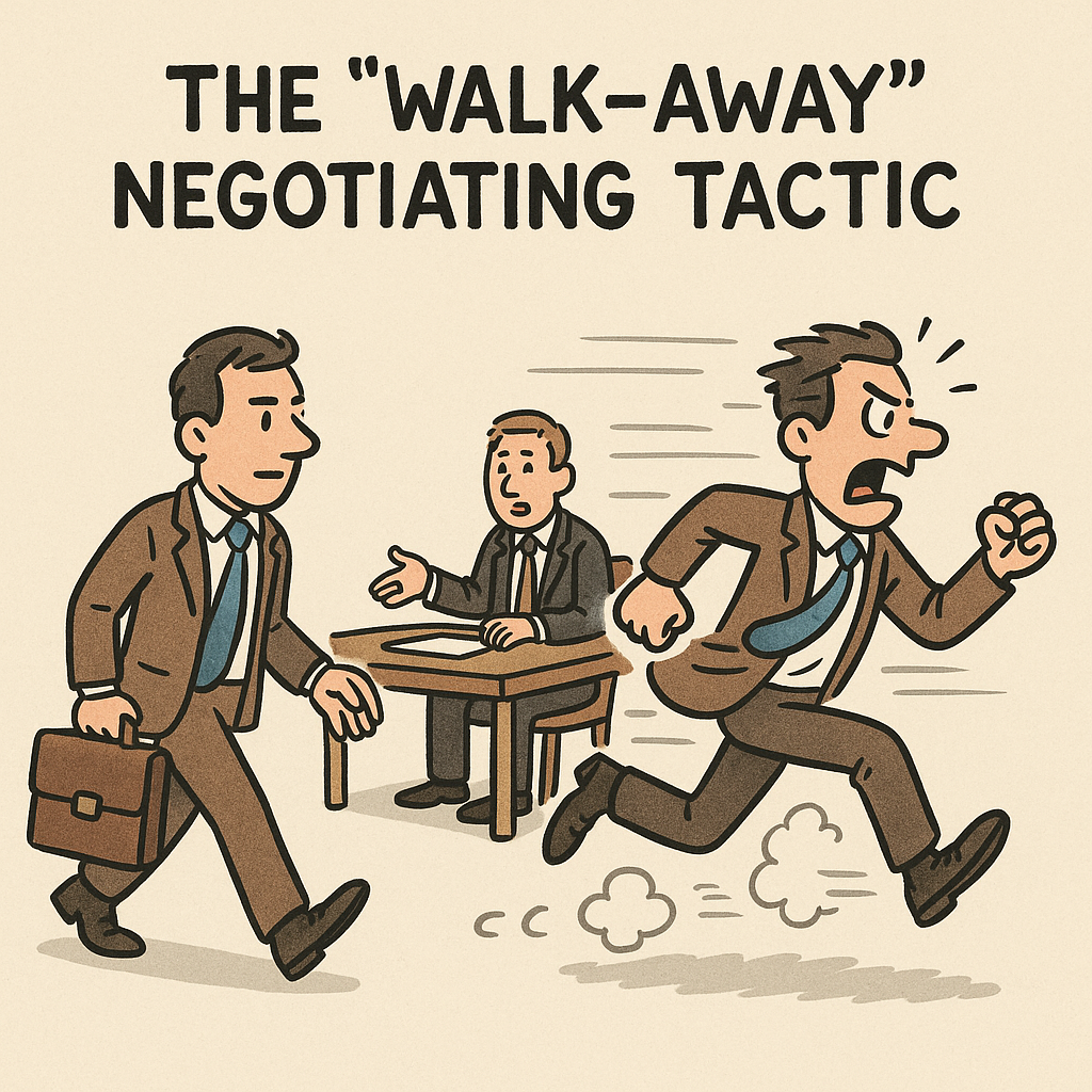 The "walk-away" negotiating tactic involves knowing your limits and being prepared to leave the negotiation if your terms are not met. This strategy can strengthen your position by showing that you are not desperate and are confident in your value, potentially leading the other party to make better offers.