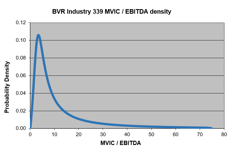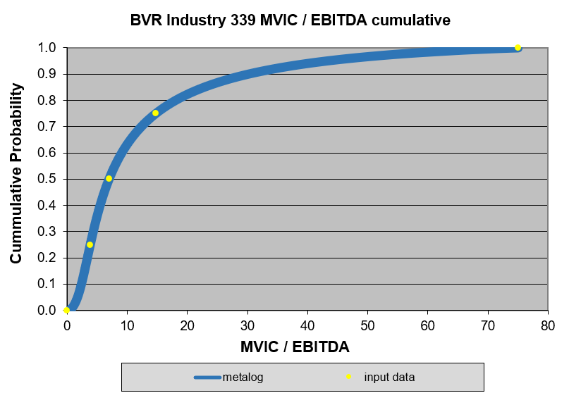 I receive new postings from SearchFunder in my Inbox. BVR calculates MVIC:EBITDA ratios from transactions. The headline reads: Industry Summaries > Miscellaneous Manufacturing (NAICS: 339). BVR publishes ratios (from two quantities, i.e., MVIC and EBITDA) along with corresponding percentiles. For example, the sample statistics are, as follows: (3.83, 25th percentile); (6.96, 50th percentile); (14.74, 75th percentile); and transaction sample size, 504, over a period of time. That's it? -- Where's the distribution? The sample size is mostly irrelevant for this calculation as only about six independent values would be necessary for robust sample statistics. Nonetheless, there is enough sample statistics to define a probability distribution. We could, then, generate random values from a specified distribution based on three statistics. The aim is to evaluate our decisions under more predictable outcomes. I've inserted the results of the MetaLog [See Note 1] to visualize the distribution, a complete picture of probabilities for a proxy on exit multiples.