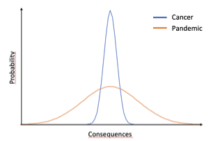 Let’s say you are few weeks ago, beginning of March. You study the average potential output of the Covid pandemic which is only at a few hundreds of cases in most western countries and for which key parameters (R0, mortality rate, etc.) are still unclear (which they are still now). Based on this, if you listen to people saying that Covid is likely to be negligible in terms of casualties compared to cancer of diabetes, you may end up doing a big mistake. Yes, cancer is killing ~600,000 people each year in the US, which is sadly huge, but it has a stable mortality rate over the years. Meaning it might kill 610,000 one year and 590,000 the other but never several millions. For a pandemic like Covid the probability of it actually reaching 2% mortality rate with high infectiousness and killing several millions of people in the US maybe low but it’s not negligible.
