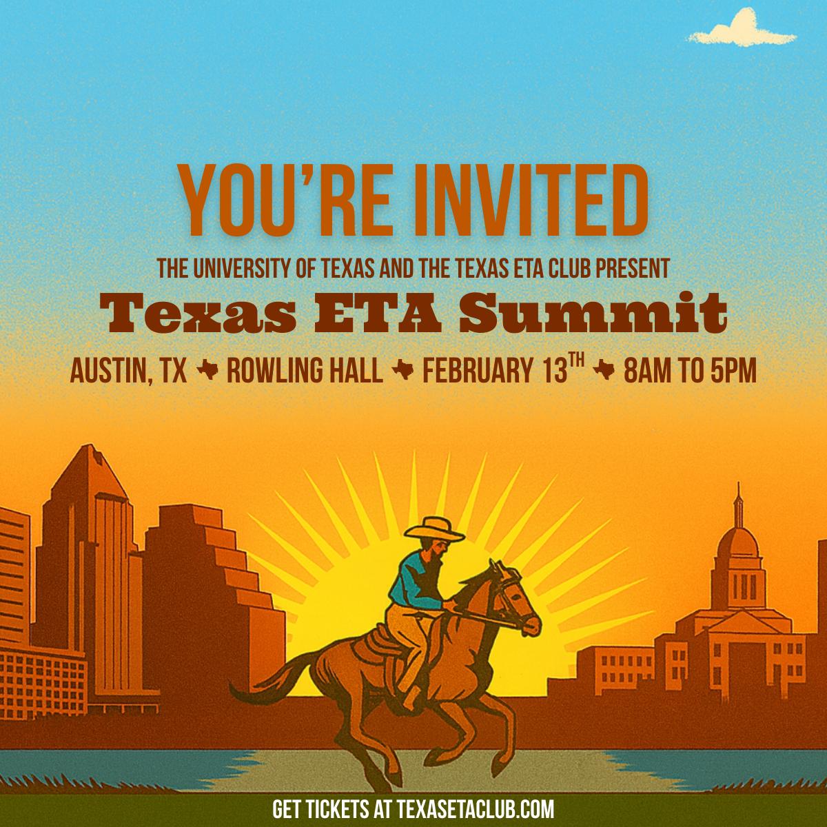 We’re inviting you to join us for the inaugural TEXAS ETA SUMMIT taking place on February 13th, 2026, at the University of Texas at Austin.