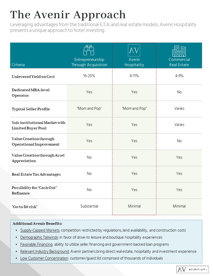 Hello search fund community! We are excited to share a high-level view of our strategy to acquire independent, boutique hotels that captures advantages of both the classic ETA and real estate models. Our approach allows us to marry the attractive value creation potential of ETA with the lowered risk profile, tax advantages and leverage potential of real estate.